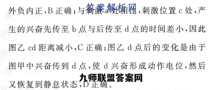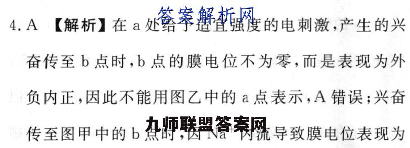 4.A【解析】在a处给予适宜强度的电刺激,产生的兴奋传至b点时,b点的膜电位不为零,而是表现为外负内正,因此不能用图乙中的a点表示,A错误;兴奋传至图甲中的b点时,因Na+内流导致膜电位表现为外负内正,B正确;与刺激a处相比,刺激位置c处,产生的兴奋先传至b点与后传至d点的时间差小,因此图乙cd距离减小,C正确;图乙d点后的变化是由于图甲中兴奋传到d点,使d兴奋形成动作电位,然后又恢复到静息状态,D正确。