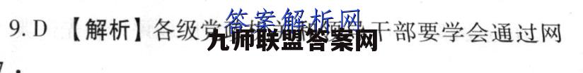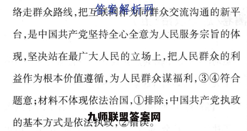 9.D【解析】各级党政机关和领导干部要学会通过网络走群众路线,把互联网作为同群众交流沟通的新平台,是党坚持全心全意为人民服务宗旨的体现,坚决站在最广大人民的立场上,把人民群众的利益作为根本价值遵循,为人民群众谋福利,③④符合题意;材料不体现依法治国,①排除;党执政的基本方式是依法执政,②错误。