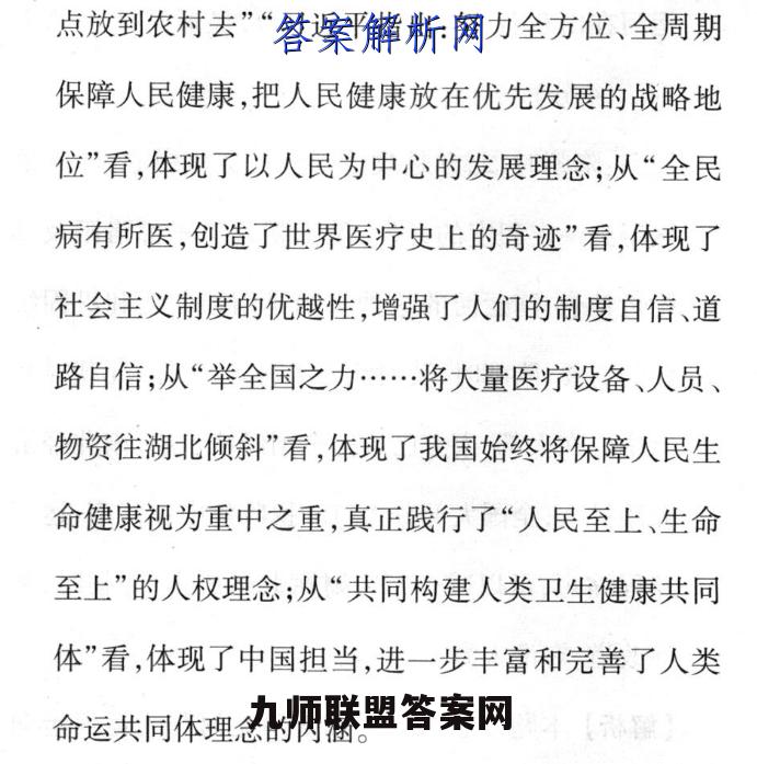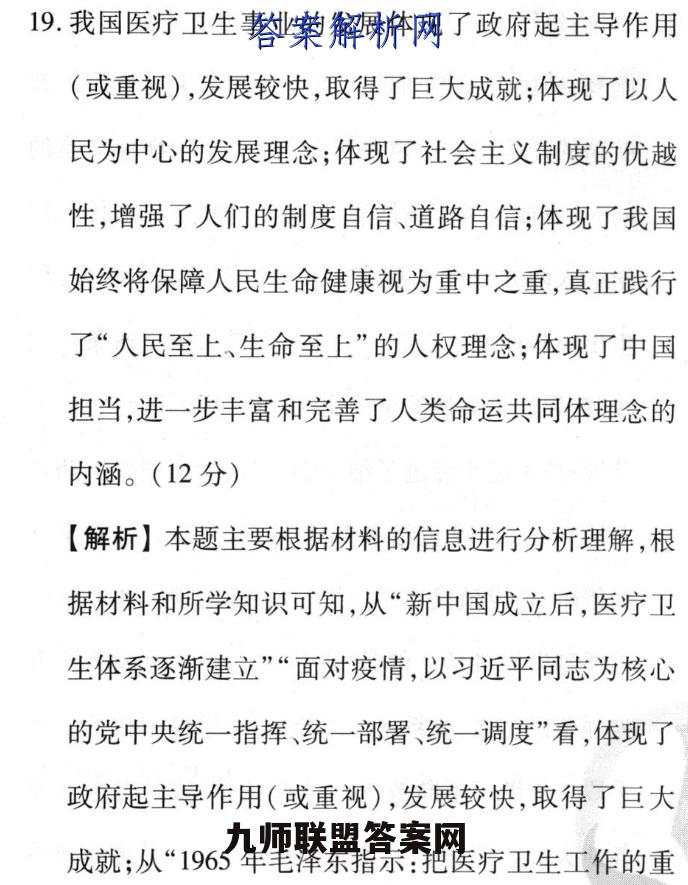 19.我国医疗卫生事业的发展体现了政府起主导作用(或重视),发展较快,取得了巨大成就;体现了以人民为中心的发展理念;体现了社会主义制度的优越性,增强了人们的制度自信、道路自信;体现了我国始终将保障人民生命健康视为重中之重,真正践行了“人民至上、生命至上”的人权理念;体现了中国担当,进一步丰富和完善了人类命运共同体理念的内涵。(12分)【解析】本题主要根据材料的信息进行分析理解,根据材料和所学知识可知,从“新中国成立后,医疗卫生体系逐渐建立”“面对疫情,以主席同志为核心的党中央统一指挥、统一部署、统一调度”看,体现了政府起主导作用(或重视),发展较快,取得了巨大成就;从“1965年毛主席指示:把医疗卫生工作的重点放到农村去”“主席指出:努力全方位、全周期保障人民健康,把人民健康放在优先发展的战略地位”看,体现了以人民为中心的发展理念;从“全民病有所医,创造了世界医疗史上的奇迹”看,体现了社会主义制度的优越性,增强了人们的制度自信、道路自信;从“举全国之力…将大量医疗设备、人员、物资往湖北倾斜”看,体现了我国始终将保障人民生命健康视为重中之重,真正践行了“人民至上、生命至上”的人权理念;从“共同构建人类卫生健康共同体”看,体现了中国担当,进一步丰富和完善了人类命运共同体理念的内涵。