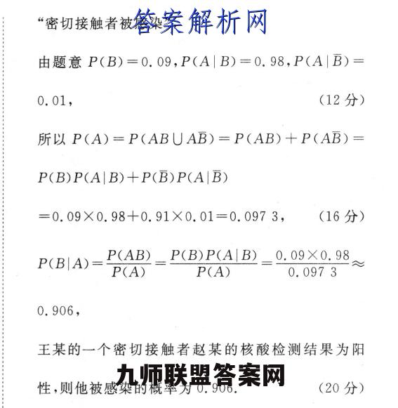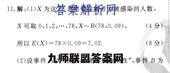 11.解:(1)X为这78名密切接触者中被感染的人数,X可取0,1,2,…,78,X~B(78,0.09),(4分)所以E(X)=78X0.09=7.02.(8分)(2)设事件A为“核酸检测结果为阳性”,事件B为“密切接触者被感染”,由题意P(B)=0.09,P(AB)=0.98,P(AB)=0.01,(12分)所以P(A)=P(ABUAB)=P(AB)十P(AB)=P(B)P(AB)+P(B)P(A B)=0.09×0.98+0.91×0.01=0.0973,(16分)P(BIA)=P(AB)=P(B)P(AIB)=0.09×0.98≈P(A)P(A)0.09730.906,王某的一个密切接触者赵某的核酸检测结果为阳性,则他被感染的概率为0.906.(20分)