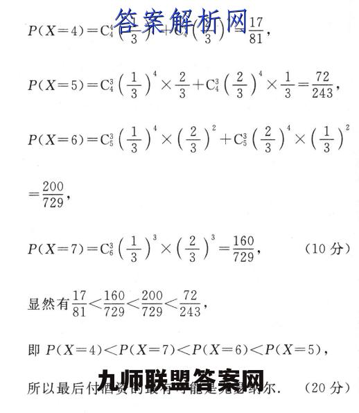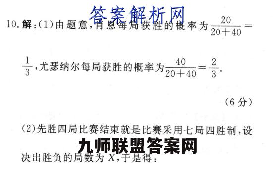 10.解:(1)由题意,肖恩每局获胜的概率为20十4020号,尤瑟纳尔每局获胜的概率为20P4040=23(6分)(2)先胜四局比赛结束就是比赛采用七局四胜制,设决出胜负的局数为X,于是得:P(x=4)=C(号)‘+C(号)°=7,P(x=5)=c(号)'×号+C(号)》'×=243P(x=6)=C(3)×(号)+C(3)×(3)200729'PX=)=C(合)'×(号)广=8,(10分)显然有品