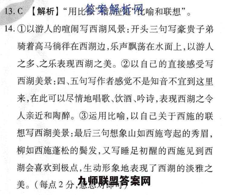 13.C【解析】“用比拟”错,应是“比喻和联想”。14.①以游人的喧闹写西湖风景:开头三句写豪贵子弟骑着高马徜徉在西湖边,乐声飘荡在水面上,以游人之多、之乐表现西湖之美。②以自己的直接感受写西湖美景:四、五句写作者感觉不是知音不宜到这里来,在此可以尽情地唱歌、饮酒、吟诗,表现西湖之令人亲近和陶醉。③运用比喻,以自己关于西施的联想写西湖美景:最后三句想象山如西施弯起的秀眉,柳如西施蓬松的鬓发,又写睡足初醒的西施见到西湖会喜欢到极点,生动形象地表现了西湖的淡雅之美。(每点2分,意思对即可)