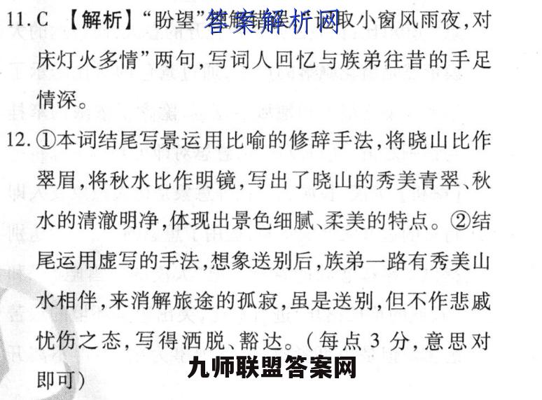 11.C【解析】“盼望”理解错误,“记取小窗风雨夜,对床灯火多情”两句,写词人回忆与族弟往昔的手足情深。12.①本词结尾写景运用比喻的修辞手法,将晓山比作翠眉,将秋水比作明镜,写出了晓山的秀美青翠、秋水的清澈明净,体现出景色细腻、柔美的特点。②结尾运用虚写的手法,想象送别后,族弟一路有秀美山水相伴,来消解旅途的孤寂,虽是送别,但不作悲戚忧伤之态,写得洒脱、豁达。(每点3分,意思对即可)