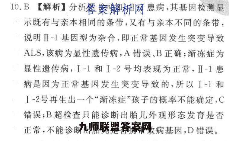 10.B【解析】分析图2可知,Ⅱ-1患病,其基因检测显示既有与亲本相同的条带,又有与亲本不同的条带,说明Ⅱ-1基因型为杂合,即正常基因发生突变导致ALS,该病为显性遗传病,A错误、B正确;渐冻症为显性遗传病,I-1和I-2号均表现为正常,Ⅱ-1患病是因为正常基因发生突变导致的,所以I-1和I-2号再生出一个“渐冻症”孩子的概率不能确定,C错误;B超检查只能诊断出胎儿外观形态发育是否正常,不能诊断出胎儿是否携带致病基因,D错误。