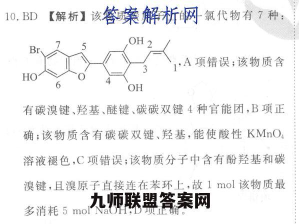 10.BD【解析】该物质碳原子上的一氯代物有7种:1,A项错误;该物质含OH有碳溴键、羟基、醚键、碳碳双键4种官能团,B项正确;该物质含有碳碳双键、羟基,能使酸性KMnO,溶液褪色,C项错误;该物质分子中含有酚羟基和碳溴键,且溴原子直接连在苯环上,故1mol该物质最多消耗5 mol NaOH,D项正确。