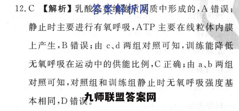 12.C【解析】乳酸是在细胞质基质中形成的,A错误静止时主要进行有氧呼吸,ATP主要在线粒体内膜上产生,B错误;由c、d两组对照可知,训练能降低无氧呼吸在运动中的供能比例,C正确;由a、b两组对照可知,对照组和训练组静止时无氧呼吸强度基本相同,D错误。