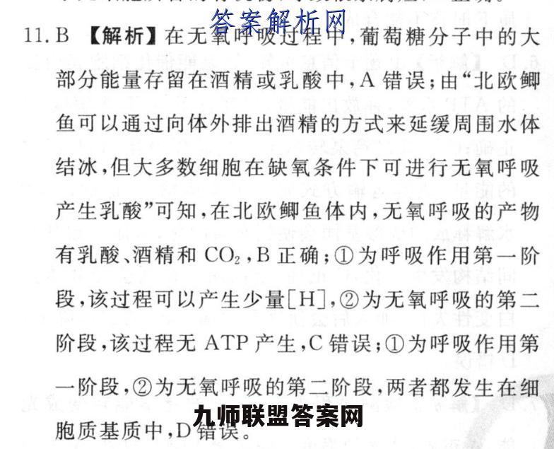 11.B【解析】在无氧呼吸过程中,葡萄糖分子中的大部分能量存留在酒精或乳酸中,A错误;由“北欧鲫鱼可以通过向体外排出酒精的方式来延缓周围水体结冰,但大多数细胞在缺氧条件下可进行无氧呼吸产生乳酸”可知,在北欧鲫鱼体内,无氧呼吸的产物有乳酸、酒精和CO2,B正确;①为呼吸作用第一阶段,该过程可以产生少量[H],②为无氧呼吸的第二阶段,该过程无ATP产生,C错误;①为呼吸作用第一阶段,②为无氧呼吸的第二阶段,两者都发生在细胞质基质中,D错误。