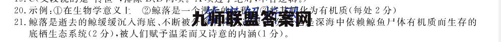 20.示例:①在生物学意义上②鲸落是一个漫长的过程③将其转化为有机质(每处2分)21.鲸落是逝去的鲸缓缓沉入海底、不断被分解消耗的过程(2分),也是深海中依赖鲸鱼尸体有机质而生存的底栖生态系统(2分),被人们赋予温柔而又诗意的内涵(1分)。