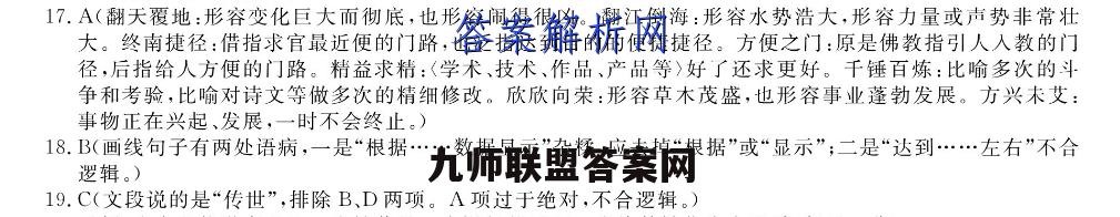 17.A(翻天覆地:形容变化巨大而彻底,也形容闹得很凶。翻江倒海:形容水势浩大,形容力量或声势非常壮大。终南捷径:借指求官最近便的门路,也泛指达到目的的便捷捷径。方便之门:原是佛教指引人人教的门径,后指给人方便的门路。精益求精:〈学术、技术、作品、产品等)好了还求更好。千锤百炼:比喻多次的斗争和考验,比喻对诗文等做多次的精细修改。欣欣向荣:形容草木茂盛,也形容事业蓬勃发展。方兴未艾:事物正在兴起、发展,一时不会终止。)18.B(画线句子有两处语病,一是“根据…数据显示”杂糅,应去掉“根据”或“显示”;二是“达到…左右”不合逻辑。)19.C(文段说的是“传世”,排除B、D两项。A项过于绝对,不合逻辑。)