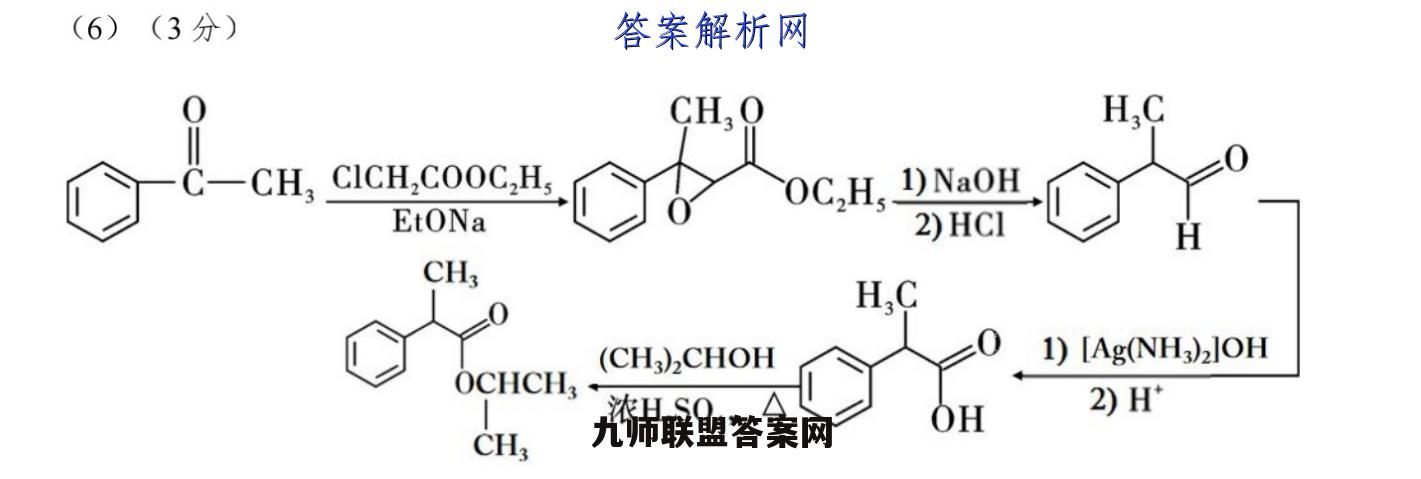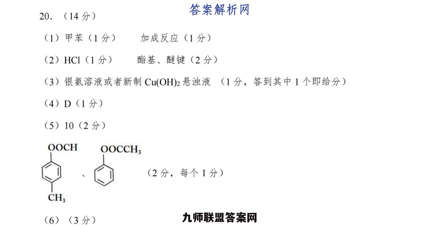 20.(14分)(1)甲苯(1分)加成反应(1分)(2)HCI(1分)酯基、醚键(2分)(3)银氨溶液或者新制Cu(OD2悬浊液(1分,答到其中1个即给分)(4)D(1分)(5)10(2分)OOCHOOCCH(2分,每个1分)CH(6)(3分)(6)(3分)0CH,OH,CC-CH,CICH,COOC,H,OC2H,1)NaOHEtONa2)HCIHCHHC(CH)CHOH)1)[Ag(NH)2JOHOCHCHOH2)HCH