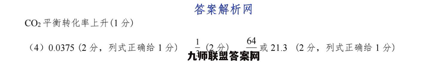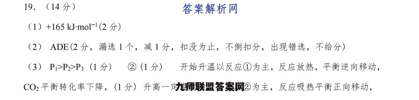 19.(14分)(1)+165 kJmol-1(2分)(2)ADE(2分,漏选1个,减1分,扣没为止,不倒扣分,出现错选,不给分)(3)P>P2>P3(1分)②(1分)开始升温以反应①为主,反应放热,平衡逆向移动,CO2平衡转化率下降,(1分)升高一定温度后,以反应②为主,反应吸热平衡正向移动,CO2平衡转化率上升(1分)(4)0.0375(2分,列式正确给1分)号2分)3或21.3(2分,列式正确给1分)