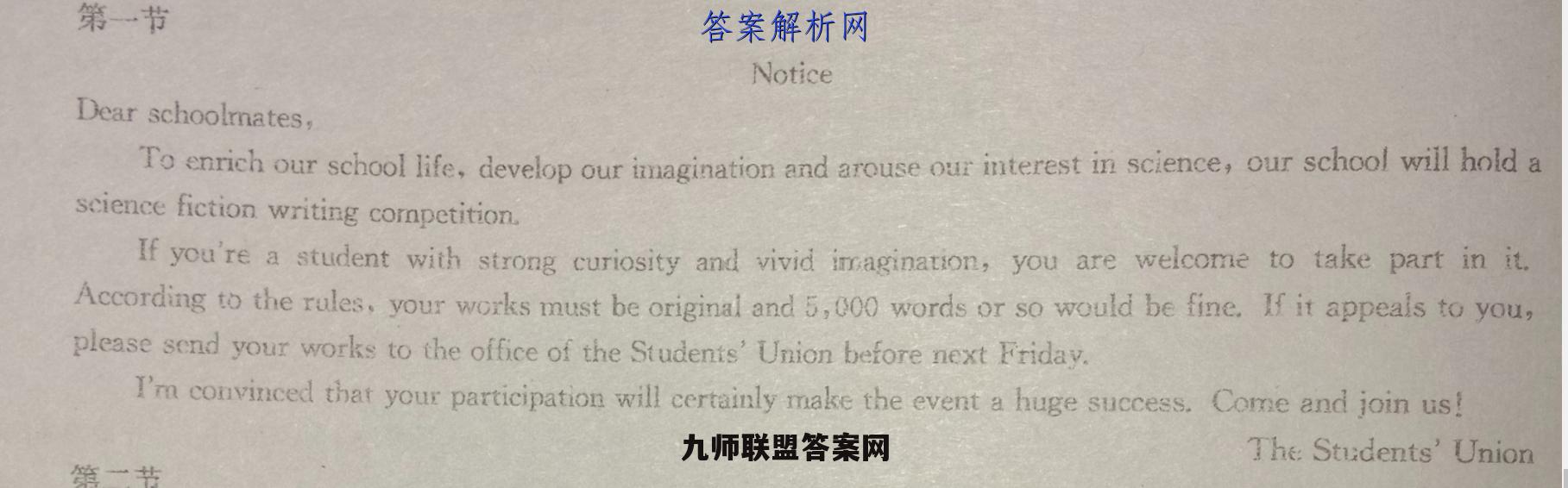 第一节NoticeDear schoolmates,Toenrich our school life,develop our imagination and arouse our interest in science,our school will hold ascience fiction writing competition.If you're a student with strong curiosity and vivid imagination,you are welcome to take part in it.According to the rules,your works must be original and 5,000 words or so would be fine.If it appeals to you,please send your works to the office of the Students'Union before next Friday.I'm convinced that your participation will certainly make the event a huge success.Come and join us!The:Students'Union箱一共