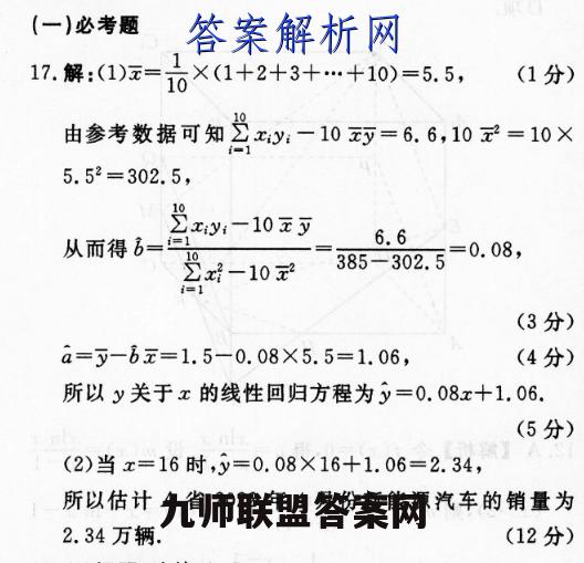 (一)必考题1.解:1)z=0×(1+2+3+…+10)=5.5,(1分)由参考数据可知3xy:-10=6.6,10云=10×5.52=302.5,从而得6=,一10元可6.6x-10元385-302.5=0.08,i=1(3分)a=y-b元=1.5-0.08×5.5=1.06,(4分)所以y关于x的线性回归方程为y=0.08x+1.06.(5分)(2)当x=16时,y=0.08×16+1.06=2.34,所以估计A省2022年4月份新能源汽车的销量为2.34万辆.(12分)