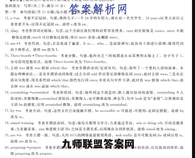 第四部分写作(共三节,满分35分)第一节单句改错(共10小题:每小题1分,满分10分)71.然+an考查不定冠问。句意:我的儿子,一个18岁的年轻人,现在是一名大学生。18-year-old发音是以元音音素开头,应用不定冠词an。故将熟改为n。72.me考在形容词比较级。句意:这个实验比我们顶料的要容易得多,casy的比较级是casicr,more不能修饰比较级,much可以修饰比较级,所以more多余,故别除more.73.me→1考查代词。句意:正是我成了赢家。I1is..,who.,,连接强调句,此处对主语进行强湖,需用代词的主格形式。故将me改为I。74.Three-fourth·Three-fourths考查分数,句意:他四分之三的钱都花在买昂贵的衣服上了。分子大于I,分母需用复数形式。故将Three-fourth改为Three-fourths,75.去掉was或在was前加which./hat考查非谓语动词/定语从句。.句意:我听了一个老妇人讲的故事。本题有两种改法:一是从非谓语动词角度,过去分词old作后置定语修饰名词s1oy,此时去掉ws:二是从定语从句角度,用关系代词which/that指代先行词story并在从句中作主语,此时在was前加which/that,故去掉was或在was前加which/that。76.astonishing·astonished考查形容词。句意:他听到这个消息时,脸上露出惊讶的表情。astonishing令人惊讶的,常修饰物:astonished震惊的,常修饰人,也可修饰表情、神态等,句中look意为“表情”,且体现的是主语he的感觉,应用astonished修饰。故将astonishing改为astonished77.byto考查介词。句意:这些文件公众接触不到。be accessible to可接近,可使用,是周定搭配。故将by改为to。78.aimed→aiming考查非谓语动词。句意:他每天都努力学习,力求通过考试。aim at doing sth.日的是做某事,力求做某事。aim和逻辑主语He之间是主谓关系,应用现在分词作状语。故将aimed改为aiming。79.are→is考查主谓一致。句意:大约80%的网络流量使用英语。web traffic是不可数名词,be动词应用is。故将are改为is。80.preparing→prepare考查非谓语动问。分析句子可知,“how十不定式”作told的宾语,后应接动词原形,故将preparing改为prepare,