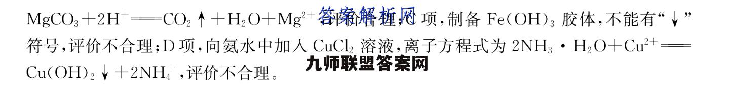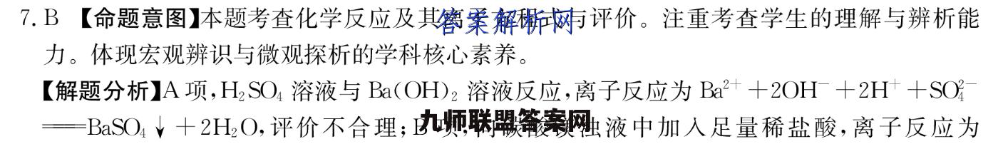 7.B【命题意图】本题考查化学反应及其离子方程式与评价。注重考查学生的理解与辨析能力。体现宏观辨识与微观探析的学科核心素养。【解题分析】A项,H2SO4溶液与Ba(OH)2溶液反应,离子反应为Ba+十2OH十2H十SO一BSO4V十2H2O,评价不合理;B项,向碳酸镁浊液中加入足量稀盐酸,离子反应为MgCO3+2H+=CO2N+H2O+Mg2+,评价合理;C项,制备Fe(OH)3胶体,不能有“”符号,评价不合理;D项,向氨水中加人CuCl2溶液,离子方程式为2NH3·H2O+Cu+Cu(OH)2Y+2NH4,评价不合理。