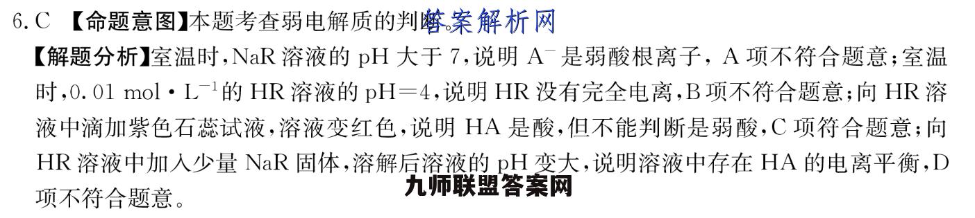 6.C【命题意图】本题考查弱电解质的判断。【解题分析】室温时,NR溶液的pH大于7,说明Aˉ是弱酸根离子,A项不符合题意;室温时,0.01mol·L1的HR溶液的pH=4,说明HR没有完全电离,B项不符合题意;向HR溶液中滴加紫色石蕊试液,溶液变红色,说明HA是酸,但不能判断是弱酸,C项符合题意;向HR溶液中加入少量NaR固体,溶解后溶液的pH变大,说明溶液中存在HA的电离平衡,D项不符合题意。