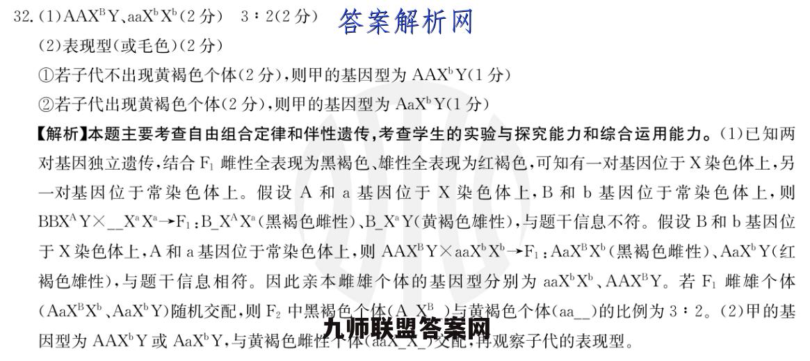 32.(1)AAXBY、aaXX(2分)3:2(2分)(2)表现型(或毛色)(2分)①若子代不出现黄褐色个体(2分),则甲的基因型为AAXY(1分)②若子代出现黄褐色个体(2分),则甲的基因型为AaXY(1分)【解析】本题主要考查自由组合定律和伴性遗传,考查学生的实验与探究能力和综合运用能力。(1)已知两对基因独立遗传,结合F1雌性全表现为黑褐色、雄性全表现为红褐色,可知有一对基因位于X染色体上,一对基因位于常染色体上。假设A和a基因位于X染色体上,B和b基因位于常染色体上,则BBXA YX XXa→F1:BXAX(黑褐色雌性)、BXaY(黄褐色雄性),与题干信息不符。假设B和b基因位于X染色体上,A和a基因位于常染色体上,则AAXY×aaXX>F1:AaxX(黑褐色雌性)、AaXY(红褐色雄性),与题干信息相符。因此亲本雌雄个体的基因型分别为aXX、AAXY。若F1雌雄个体(AaXBX、AaXY)随机交配,则F2中黑褐色个体(AXB)与黄褐色个体(aa)的比例为3:2。(2)甲的基因型为AAXY或AaXY,与黄褐色雌性个体(aaXX)交配,再观察子代的表现型。