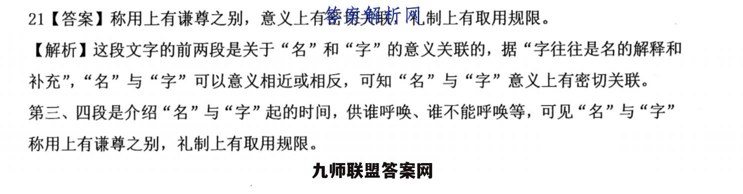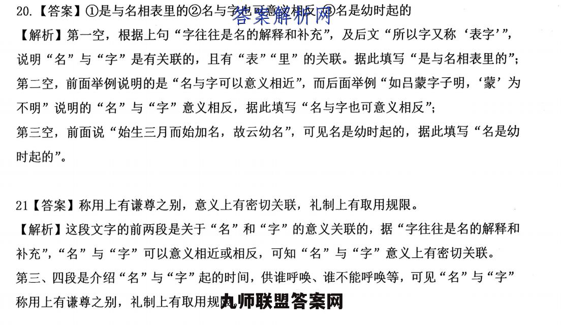 20.【答案】①是与名相表里的②名与字也可意义相反③名是幼时起的【解析】第一空,根据上句“字往往是名的解释和补充”,及后文“所以字又称‘表字’”,说明“名”与“字”是有关联的,且有“表”“里”的关联。据此填写“是与名相表里的”;第二空,前面举例说明的是“名与字可以意义相近”,而后面举例“如吕蒙字子明,‘蒙’为不明”说明的“名”与“字”意义相反,据此填写“名与字也可意义相反”;第三空,前面说“始生三月而始加名,故云幼名”,可见名是幼时起的,据此填写“名是幼时起的”。21【答案】称用上有谦尊之别,意义上有密切关联,礼制上有取用规限。【解析】这段文字的前两段是关于“名”和“字”的意义关联的,据“字往往是名的解释和补充”,“名”与“字”可以意义相近或相反,可知“名”与“字”意义上有密切关联。第三、四段是介绍“名”与“字”起的时间,供谁呼唤、谁不能呼唤等,可见“名”与“字”称用上有谦尊之别,礼制上有取用规限。