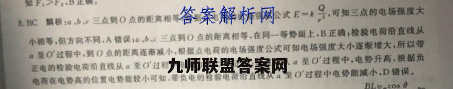 知F1>上5止&C解析:0b(三点到O点的距离相等,根据点电荷的电畅强度公式E=9,可知三点的电杨强度大小相等,但方向不同,A错误:a,bc三点到O点的距离相等,在同一等势面上,B正确:检验电荷沿直线从:至O过程中,到O点的距离逐渐减小,根据点电荷的电场强度公式可知电场强度大小逐渐增大,所以带正电的检验电荷沿直线从@至O'过程中电场力增大,C正确:沿直线从a至O'过程中,电势升高,根据负电荷在电势高的位置电势能较小可知,带负电的检验电荷沿直线从至O过程中电势能减小,D错误。BLv cos 6