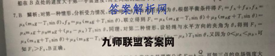 船在B点处的是度人于弟一于围是发1,B解析:对第一种情形,分析受力情况,设轻绳与水平方向的夹角为8,根据平衡条件得F,=∫a十。,∫a=A(mg一Tsin),fa=a(msg+T,n),联立得到F,=a(nAg-T,sin8)十Ha(mng十T,sin0)=严AmAg十mg十(。一)T,sn9,同理,对第二种情形,设轻绳与水平方向的夹角为8,得到F,=ra(mAg十T:sin9)十r:(m=g一T:sin0)=HAmAg十tam ag一(rm一a)T:sin0,又因为0 F,B正确,Q可知三占的由场强度大