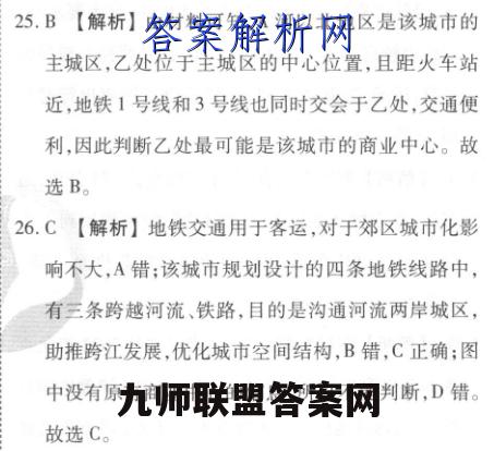 25.B【解析】由材料可知,A河以北地区是该城市的主城区,乙处位于主城区的中心位置,且距火车站近,地铁1号线和3号线也同时交会于乙处,交通便利,因此判断乙处最可能是该城市的商业中心。故选B。26.C【解析】地铁交通用于客运,对于郊区城市化影响不大,A错:该城市规划设计的四条地铁线路中,有三条跨越河流、铁路,目的是沟通河流两岸城区,助推跨江发展,优化城市空间结构,B错,C正确:图中没有原有商业中心的信息,所以不能判断,D错。故选C。