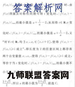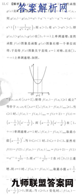12.C【解析】令g(x)=a'+a(a>1),显然函数g(x)是R上的偶函数,xx4∈(0,十∞),x 1,有>a的>1,即g(x:)>g(x),g(x)在[0,十∞)上单调递增,显然函数f(x)图象是函数g(x)图象右移一个单位而得,于是得f(x)图象关于直线x=1对称,且在[1,十○)上单调递增,如图,12“3x1,x∈[1,1+2],使得f()-f(xa)≥1成立”等价于xx∈[t,t+2],|f(x)-f(x)m.≥1,当≥1时,lf(x)-f(x)lm.=f(t+2)-f(t)■(a-)(c-)小而(a-是)(e-)在[1,+o∞)单周递增,t=1时,f()一f(:)取最小值(a-)',当0<<1时,2<+2<3,显然有f(0)=f(2),lf(x1)-f(xa)l.=f(t+2)-f(1)=a1+六-2,而+-2在[01D上递增,则=0时,f(工)-f(x)取最小值a+1-2.因(a-2)-(a+是-2)-(a-1)(a-))>0,因此,当≥0t变化时,f(红)f()的最小值是a十】一2,当t<0时,由f(x)图象及对称性同理可得t变化时,1f()一f)川的最小值是a十】一2,从而得t∈R,t变化时,f(x)-fx)的最小值是a十】一2,又“对Vt∈R,均31,x∈[t,t+2],使得f(x)f(:)≥1成立”,即长度为2的任意区间上都存在两个自变量值x1x,使得f(x)一f(x)≥1成立,等价于当t变化时,lf(x)一f(x).的最小值不小于1,于是得a+二-2≥1,而a>1,解得a≥3+5,所以a的最小值为3+5.故选C2