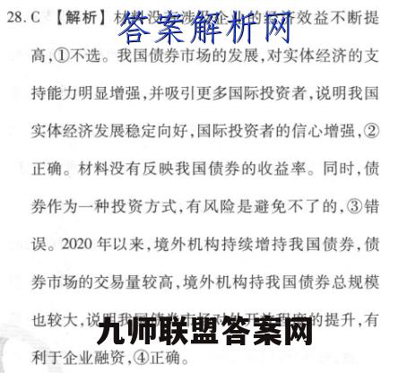 28.C【解析】材料没有涉及企业的经济效益不断提高,①不选。我国债券市场的发展,对实体经济的支持能力明显增强,并吸引更多国际投资者,说明我国实体经济发展稳定向好,国际投资者的信心增强,②正确。材料没有反映我国债券的收益率。同时,债券作为一种投资方式,有风险是避免不了的,③错误。2020年以来,境外机构持续增持我国债券,债券市场的交易量较高,境外机构持我国债券总规模也较大,说明我国债券市场对外开放程度的提升,有利于企业融资,④正确。