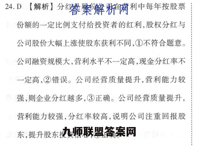 24.D【解析】分红是股份公司在营利中每年按股票份额的一定比例支付给投资者的红利,股权分红与公司股价大幅上涨使股东获利不同,①不符合题意公司融资规模大,营利水平不一定高,现金分红率不一定高,②错误。公司经营质量提升,营利能力较强,则企业分红越多,③正确。公司经营质量提升,营利能力较强,分红率较高,说明公司注重回报股东,提升股东投资信心,④正确